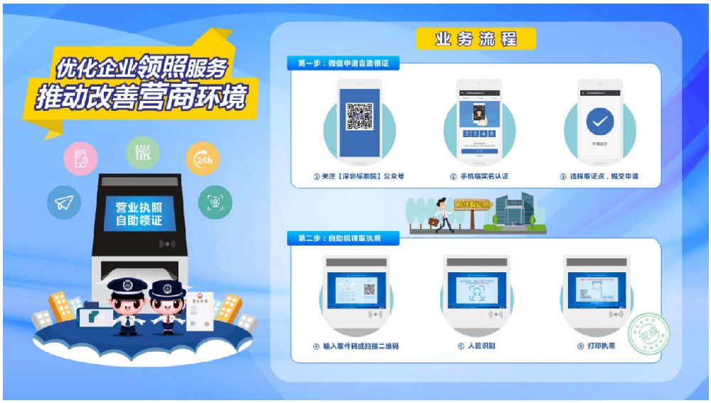 3、审批通过后,如需领取营业执照,有三种渠道办理:一是在设立登记时申请邮政寄递服务,二是通过24 小时自助打照机办理,三是到各区行政服务大厅窗口领取。